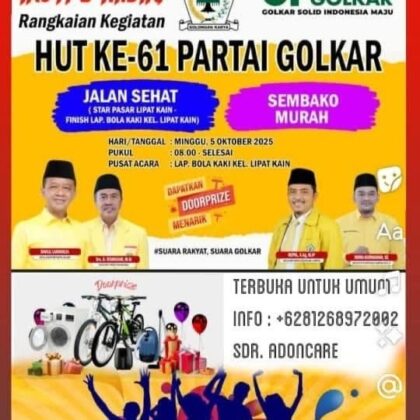 Kampar Golkar Kampar Rayakan 61 Tahun dengan Jalan Sehat, Senam Massal, dan Pasar Murah Oleh Redaksi • 4 Oktober 2025 •