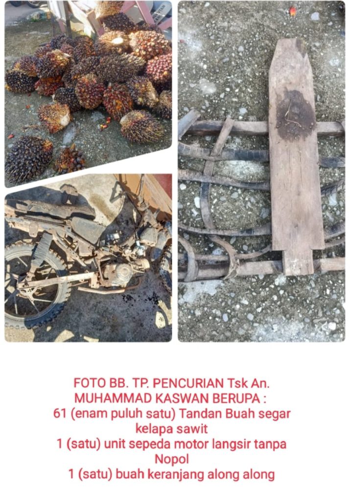Atas kejadian tersebut pihak Perusahaan mengalami kerugian materil kurang lebih Rp.1.800.000,- kemudian sekira pelapor membawa pelaku beserta barang bukti berupa: 61 Tandan buah segar kelapa sawit, 1 unit sepeda motor merk langsir tanpa Nopol, buah keranjang along along Ke polsek Bangko dan selanjutnya pelapor melaporkan kejadian tersebut. Selanjutnya Polsek Bangko menahan dan menindak saudara pelaku dengan menggunakan Pasal 364 KUHPidana,”jelasnya.(AHA)
