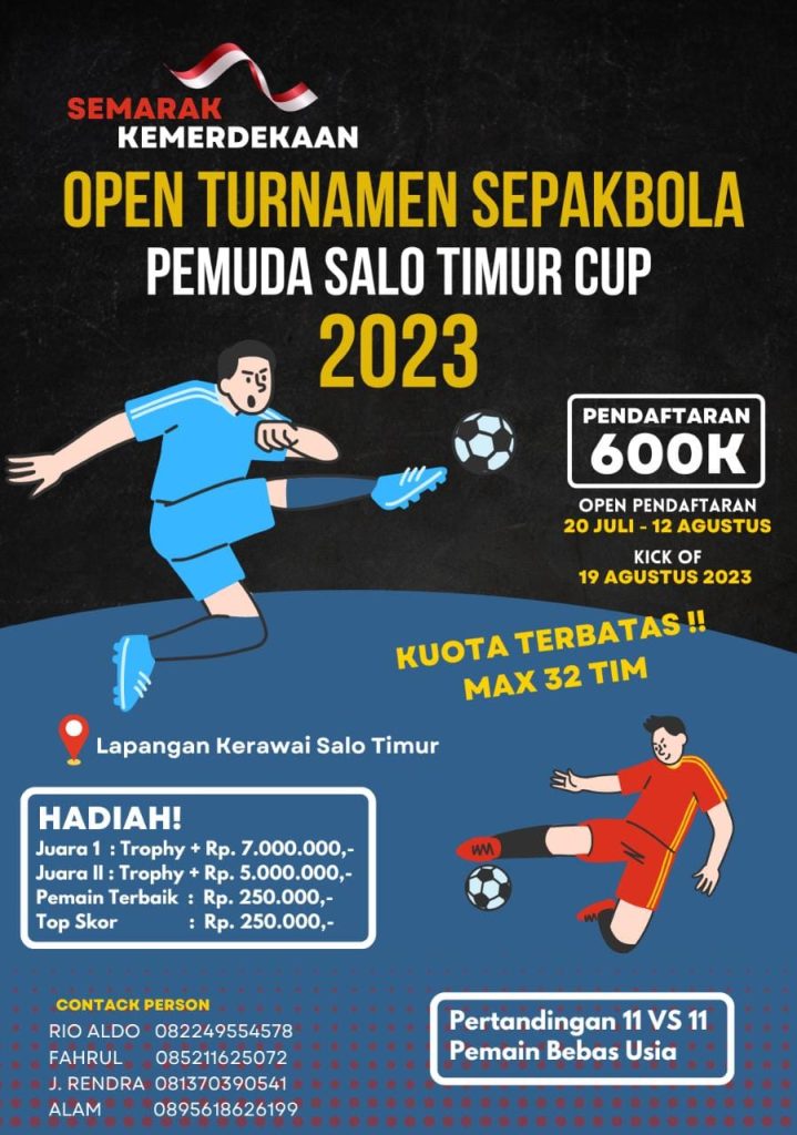 “Turnamen sepak bola ini merupakan inisiatif pemuda Desa Salo Timur. Kita picu kreativitas kawan-kawan untuk berkegiatan dan Insya Allah 32 tim akan berlaga di Lapangan Kerawai Desa Salo Timur,” katanya.