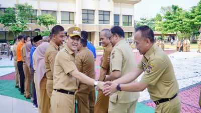 Usai apel pagi dilanjutkan jabat tangan antara Pj Bupati, Plh Sekda dan Asisten serta para pejabat dilingkungan Kabupaten Kampar.(adv)