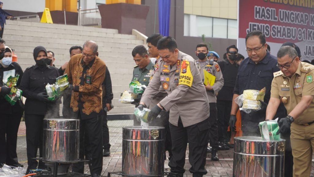 PEKANBARU(RakyatTimes.id) – Kepolisian Daerah (Polda) Riau, memusnahkan barang bukti narkoba hasil sitaan saat melakukan pengungkapan kasus.