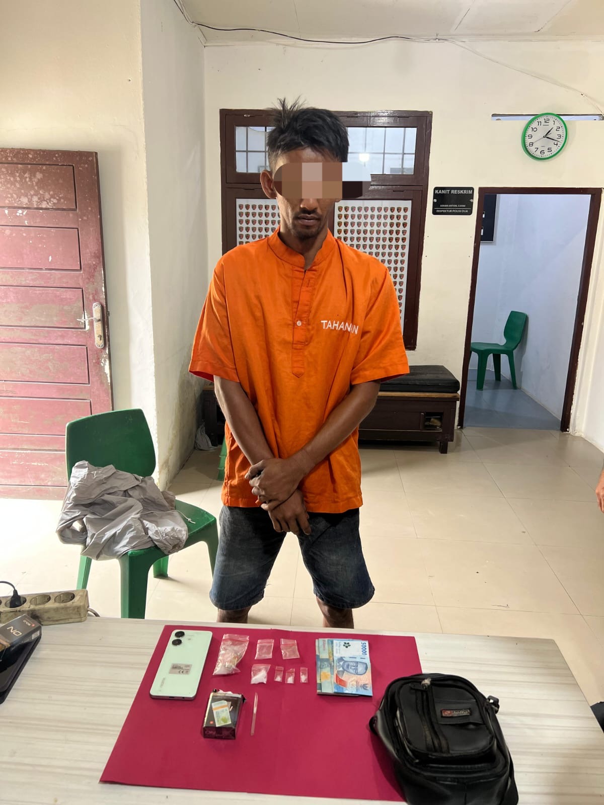 “Disana kita langsung lakukan penggeledahan badan ditemukan. Tas yang berisikan kotak rokok yang berisikan sabu-sabu dan barang bukti lainnya,”ungkap AKP Aulia.